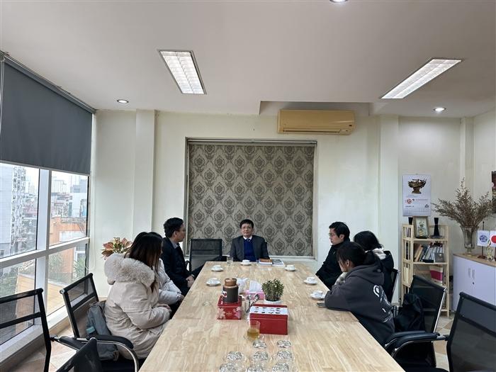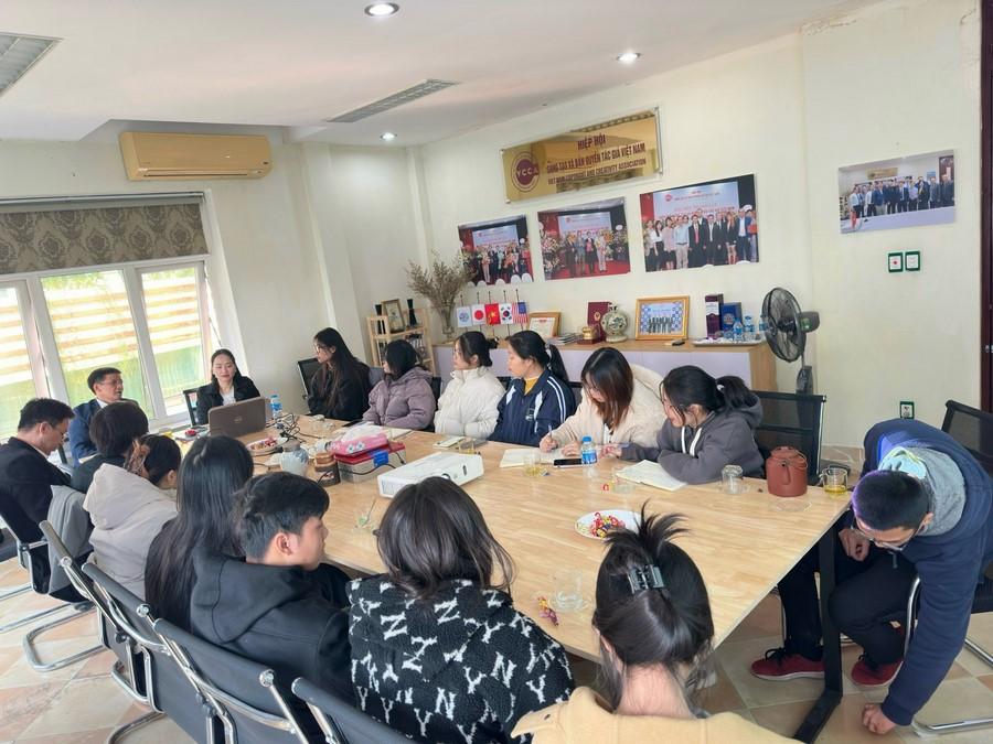 Sinh viên Trường ĐHKHXHNV đã tới trụ sở VCCA để thực tập vào tháng 1/2024, với sự hướng dẫn trực tiếp của Chủ tịch Hiệp hội VCCA Bùi Nguyên Hùng (ảnh giữa).